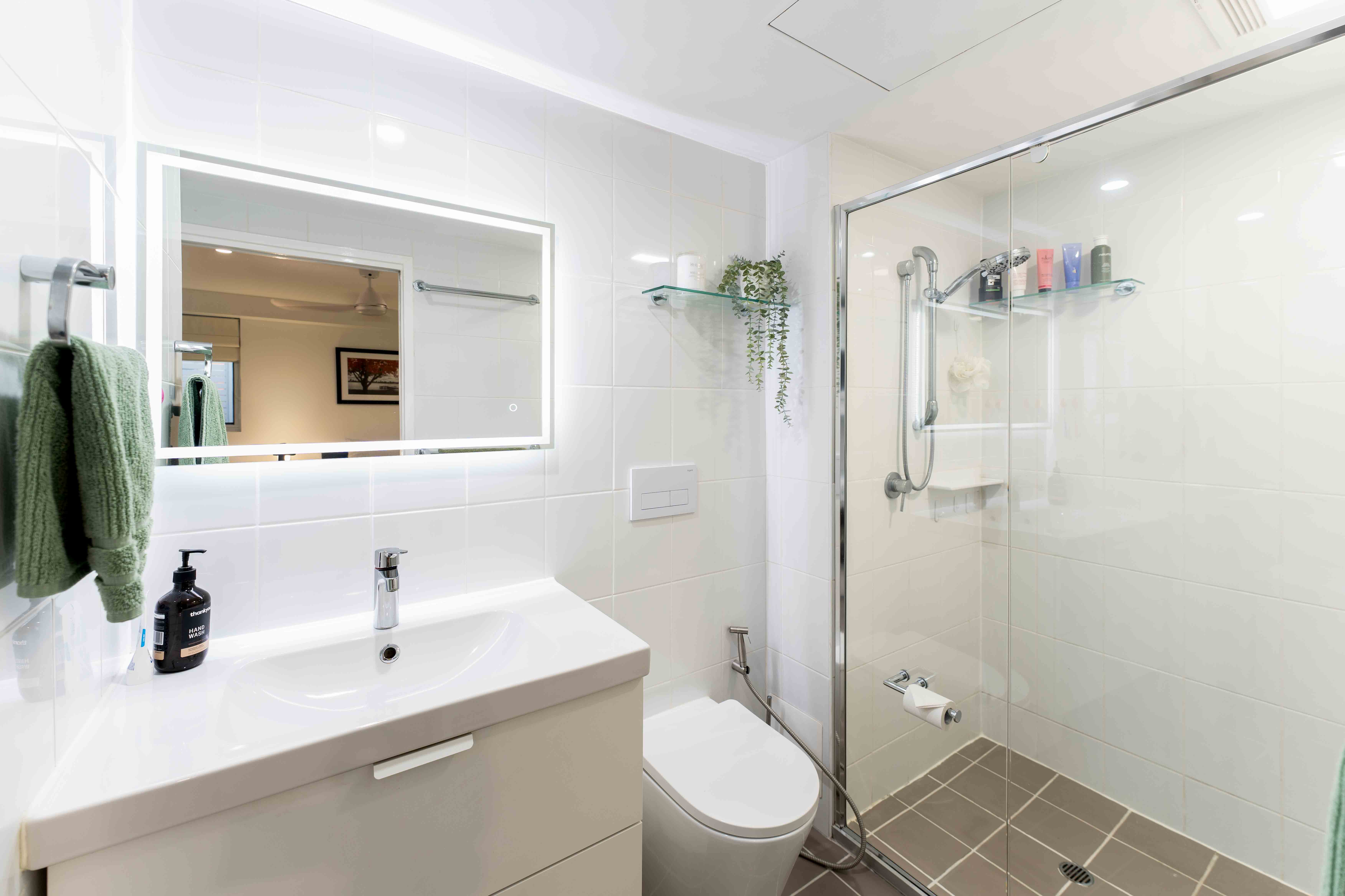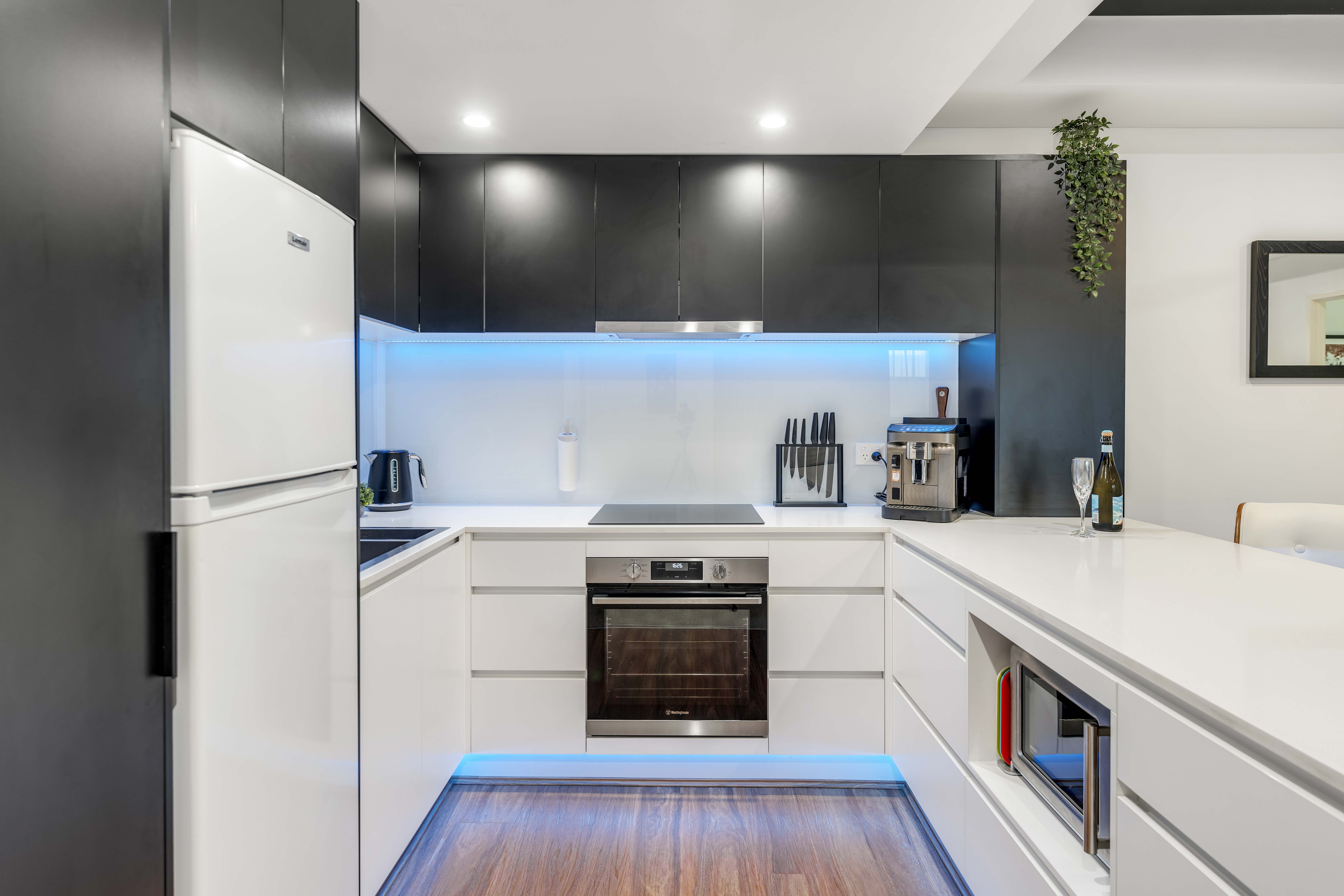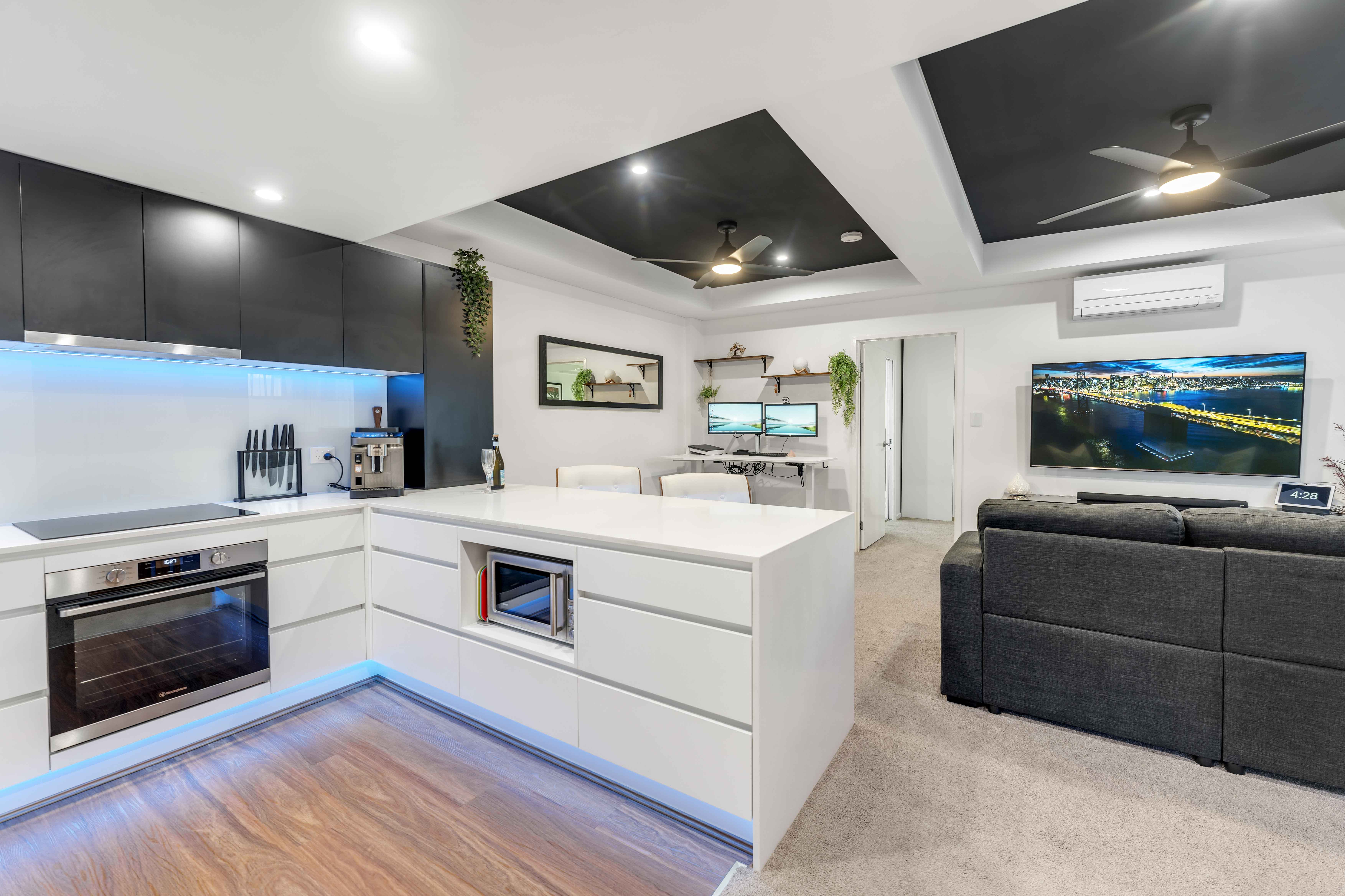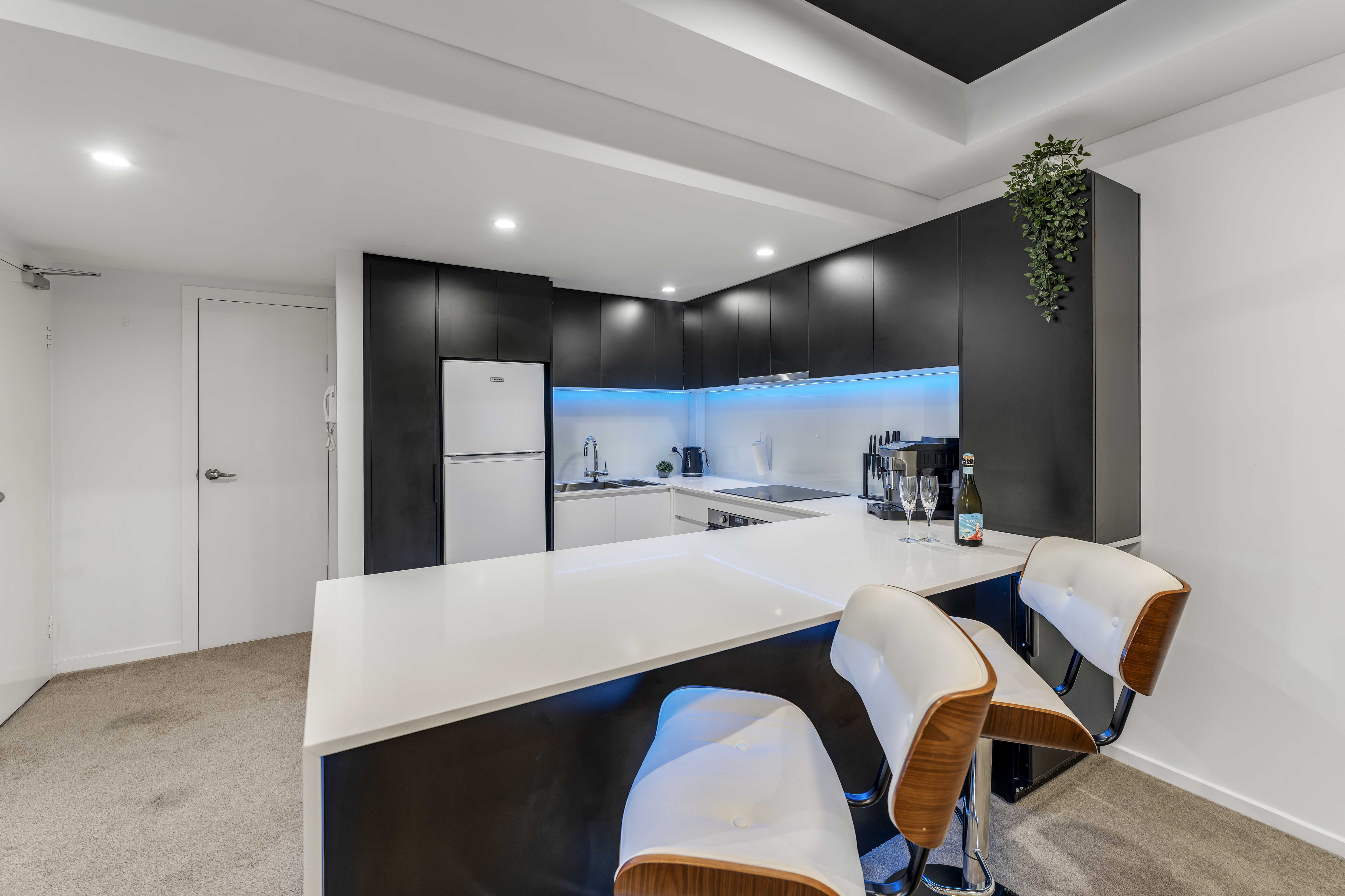 The apartment itself features ample built-in storage, including wardrobes, additional built-in cupboards, and hidden storage on the long outdoor patio. The full-size kitchen includes an induction hot plate and built-in filtered water tap. There's even a secret hidden bar with a dedicated drinks fridge in the kitchen-perfect for entertaining.