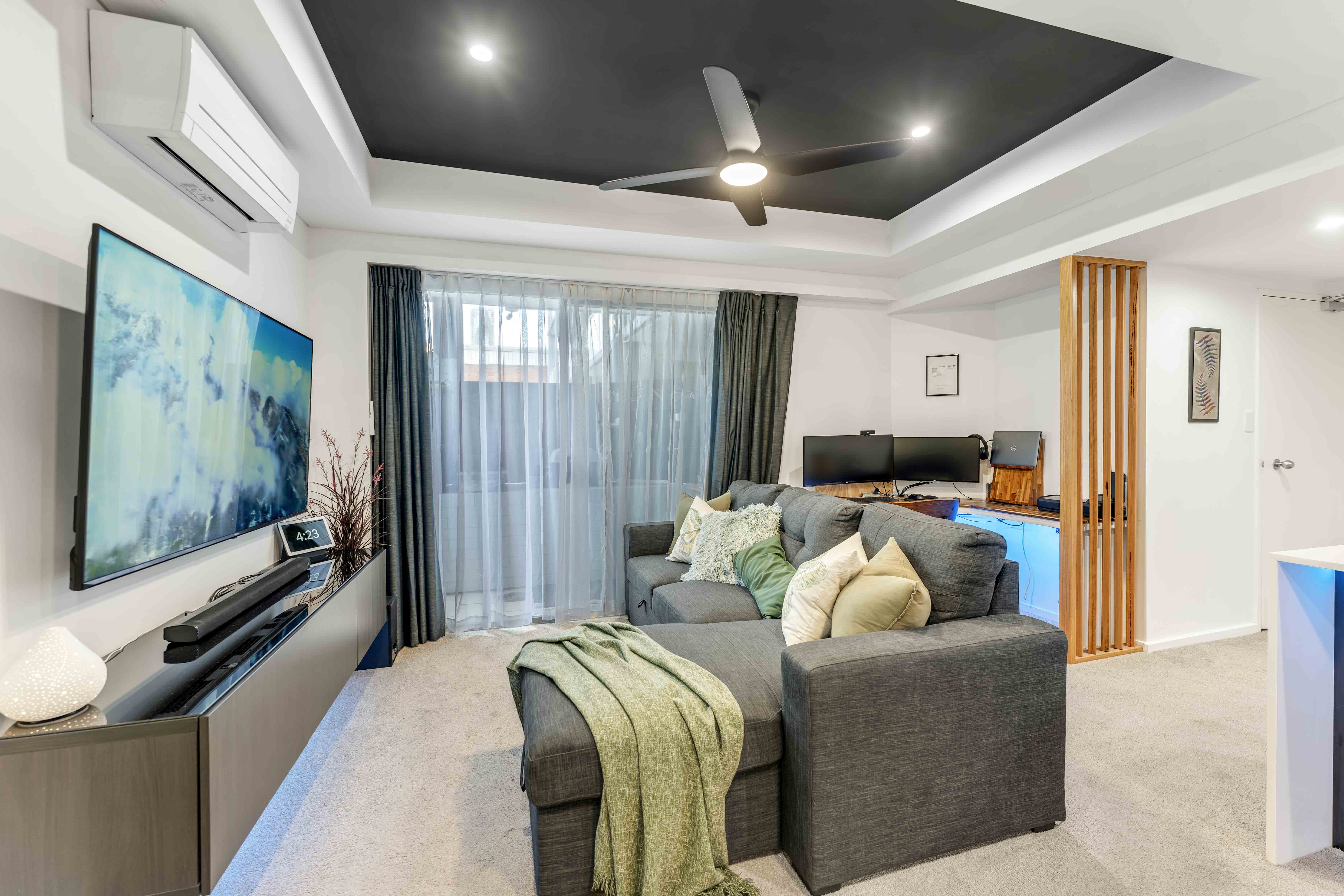 Comfort and convenience are guaranteed with WiFi-enabled air conditioning in both the bedroom and lounge, alongside ceiling fans. A smart lighting system with LED strip lights adds customizable ambiance to the space, while black-out curtains ensure privacy.