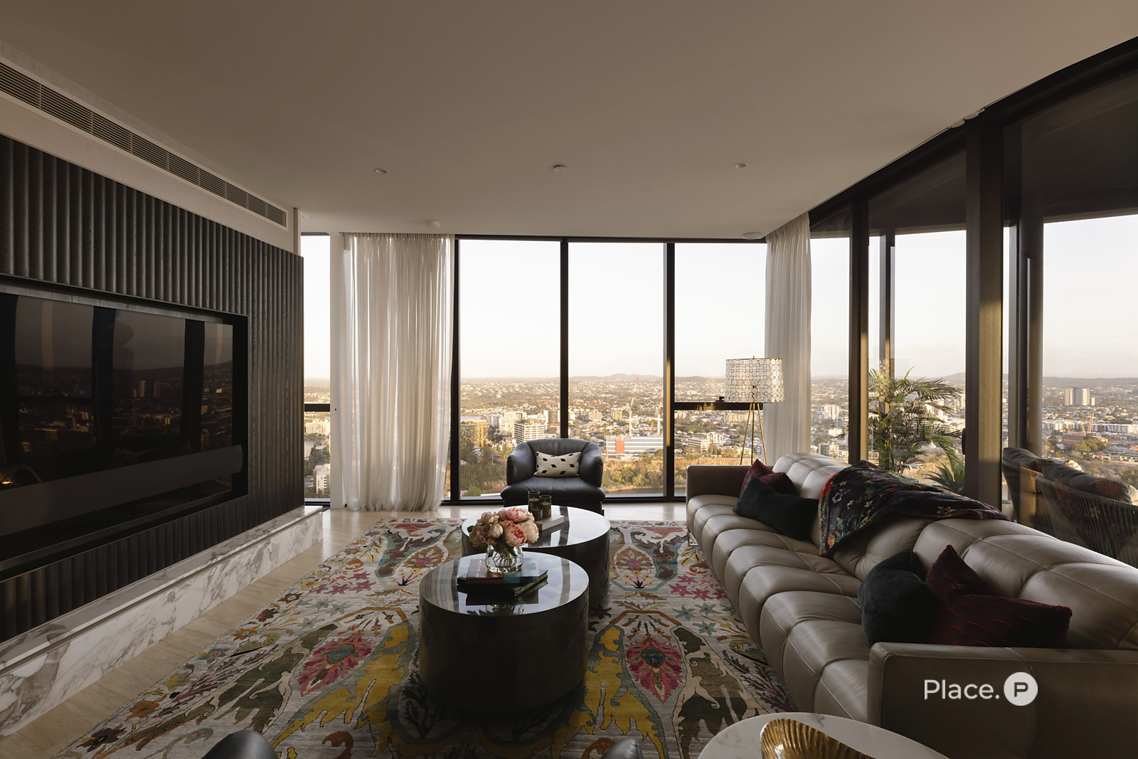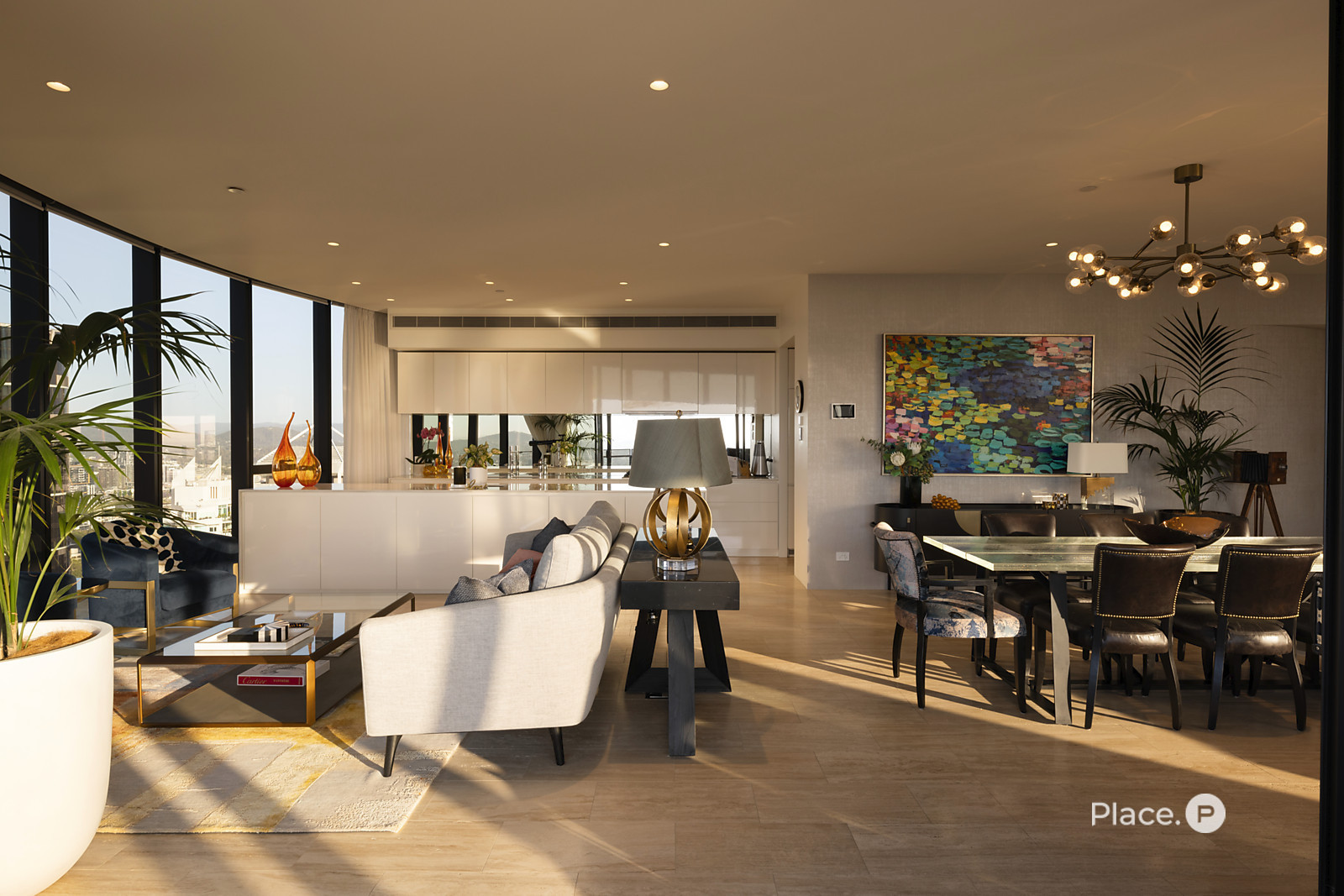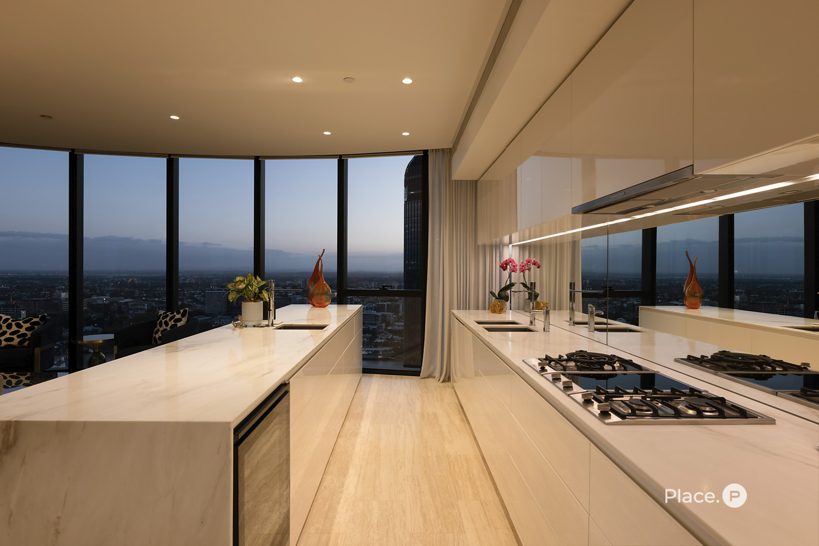 The property flows from its grand entry to a wonderfully spacious open-plan living and dining area. Looking out across Brisbane's dynamic landscape below, this light-filled central space seamlessly connects to a partially-enclosed balcony. Custom curved glass allows you to fully appreciate the breathtaking vista, while also complementing the residence's contemporary structure.