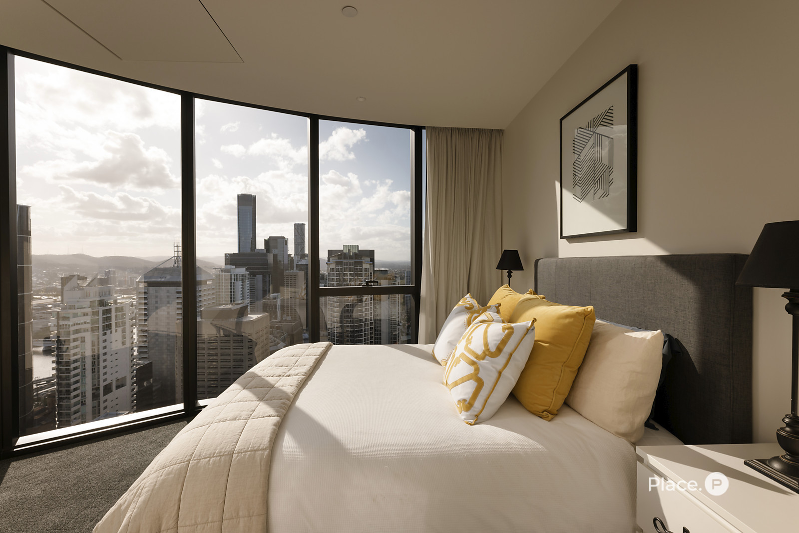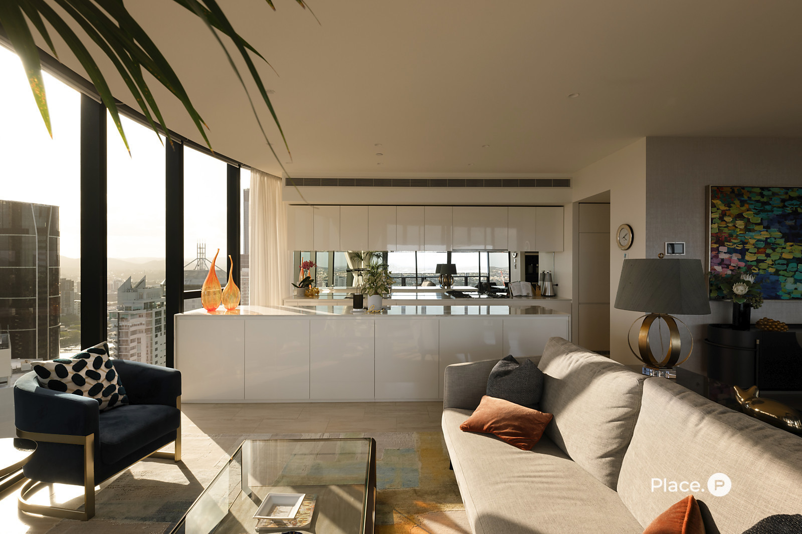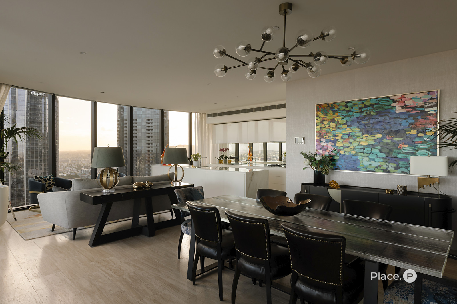The property flows from its grand entry to a wonderfully spacious open-plan living and dining area. Looking out across Brisbane's dynamic landscape below, this light-filled central space seamlessly connects to a partially-enclosed balcony. Custom curved glass allows you to fully appreciate the breathtaking vista, while also complementing the residence's contemporary structure.
