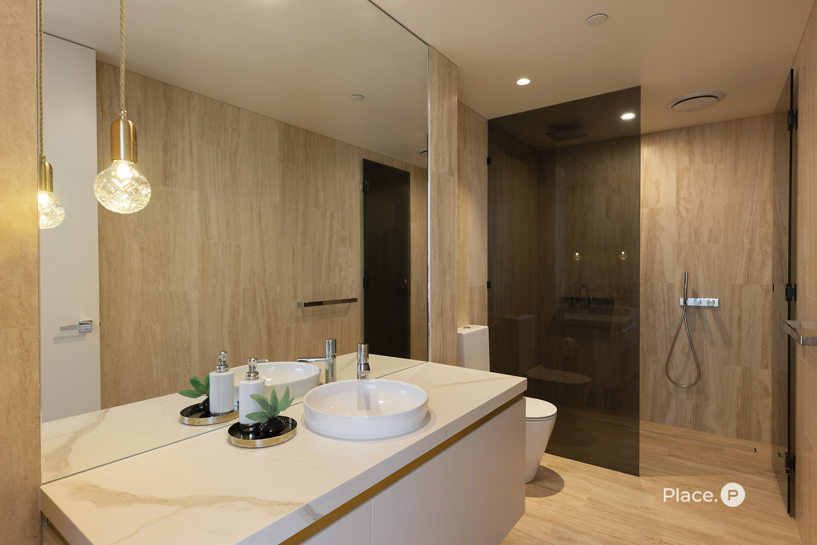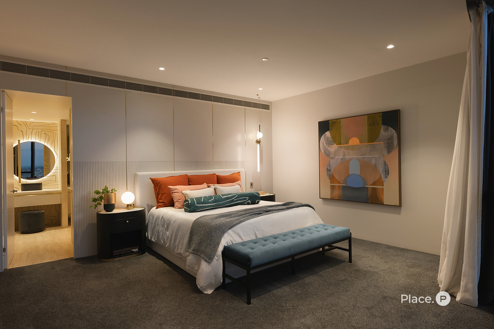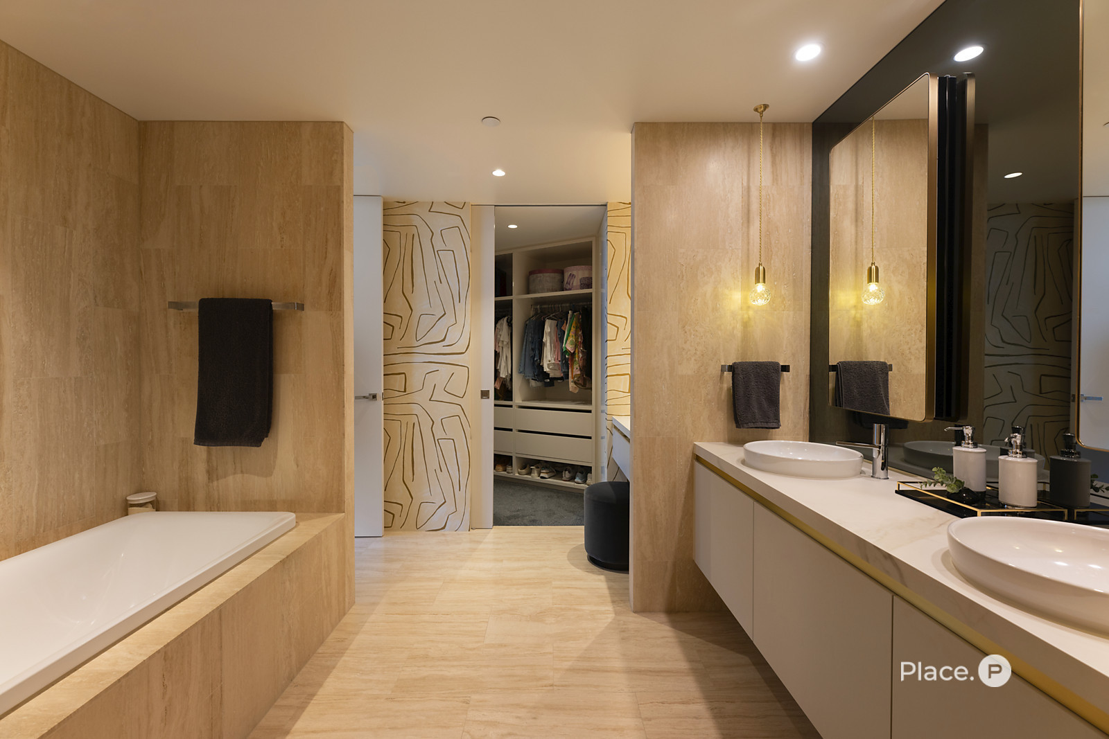 Benefitting from its own spellbinding outlook, an opulent master suite has a bespoke walk-in robe and a bespoke feature wall with a light feature. An attached ensuite boasts travertine tiling, an art-inspired vanity, a bath, a separate shower and a bidet.