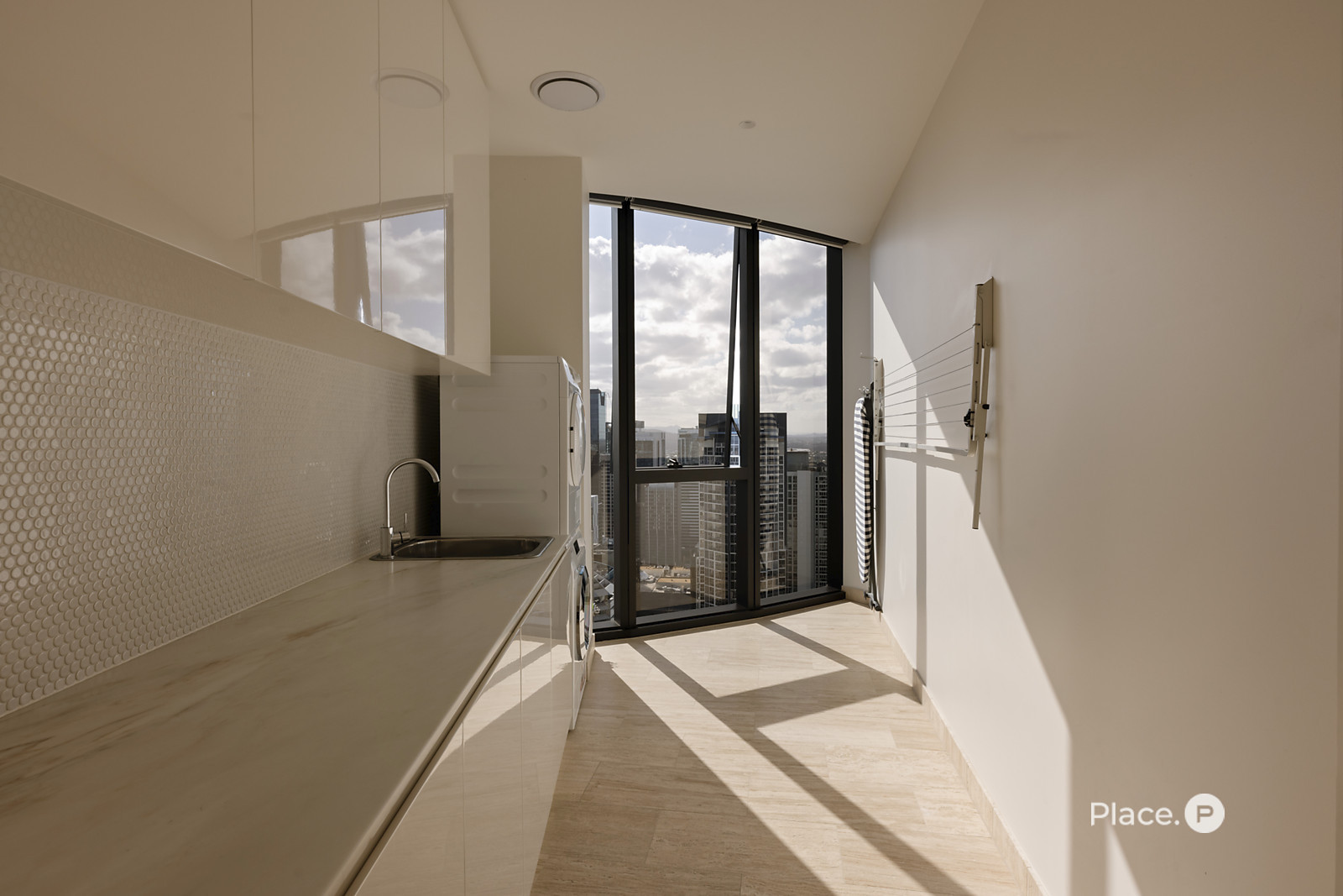 Thoughtfully crafted to reflect its elevated status and urban setting, the prestige penthouse showcases a unique curvilinear external design framed in floor-to-ceiling glass. Lofty three-metre-high ceilings, sleek tiled floors and striking pendant lights also feature throughout, creating an air of elegance. Tasteful renovations add to the abode's appeal. Expect extra storage, new benchtops, fittings, bespoke wallpaper, carpet and an impressive black feature wall in the living area showcasing a Murano glass light feature.