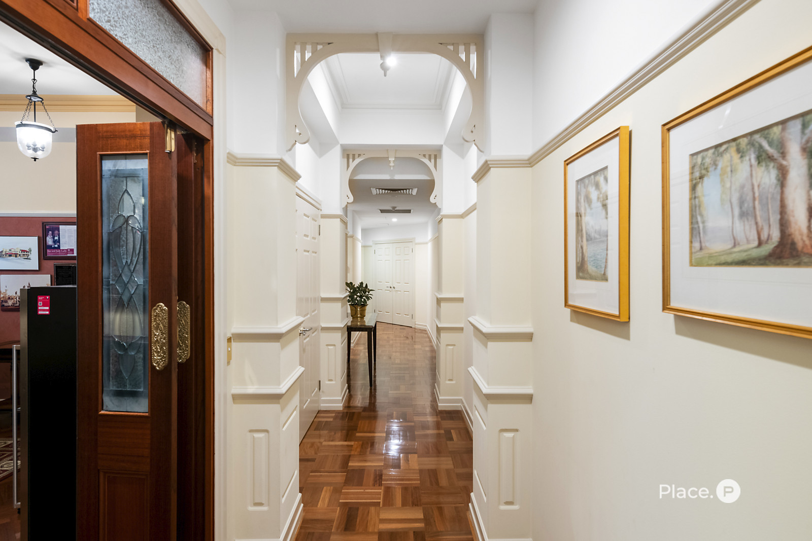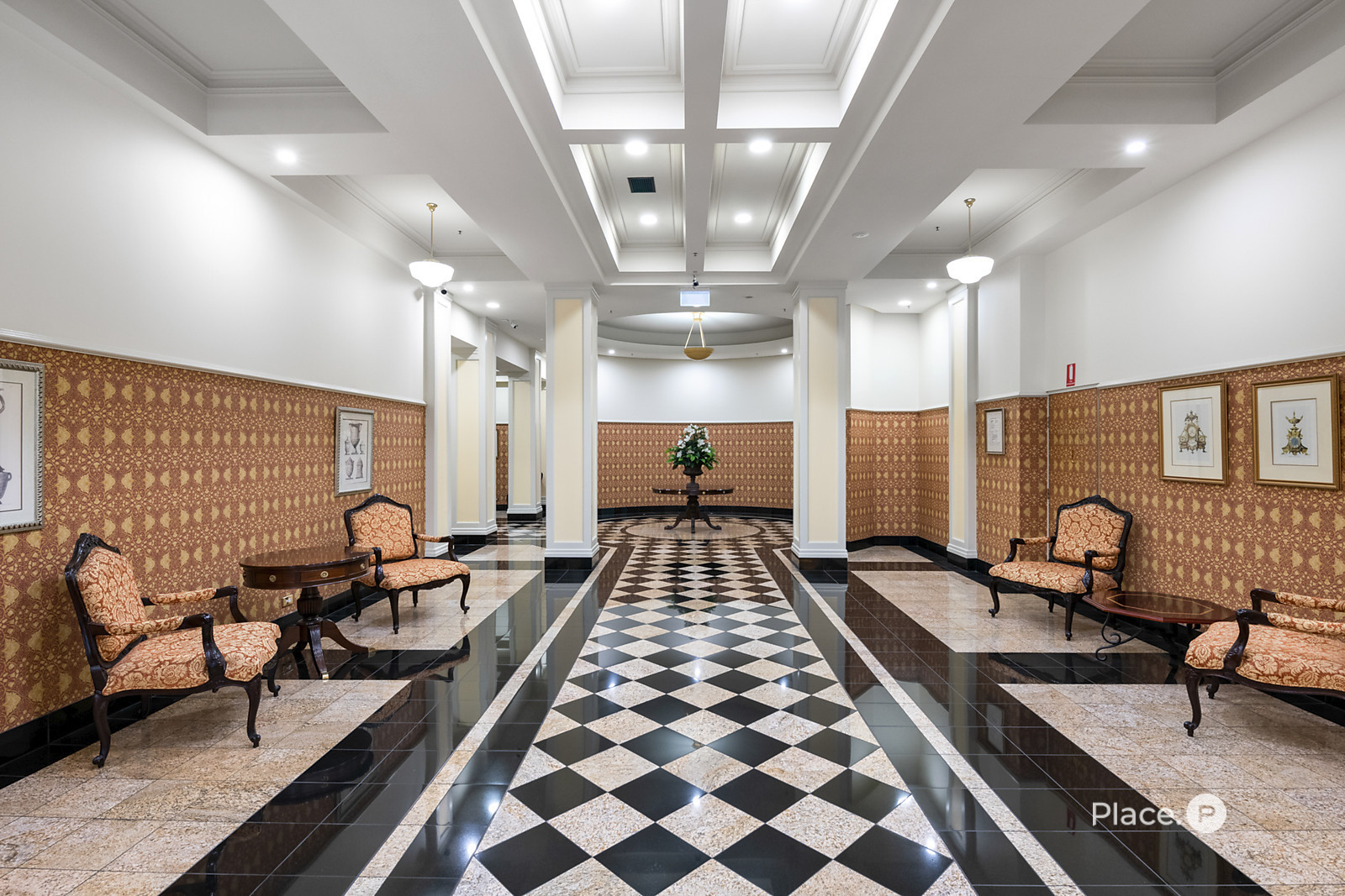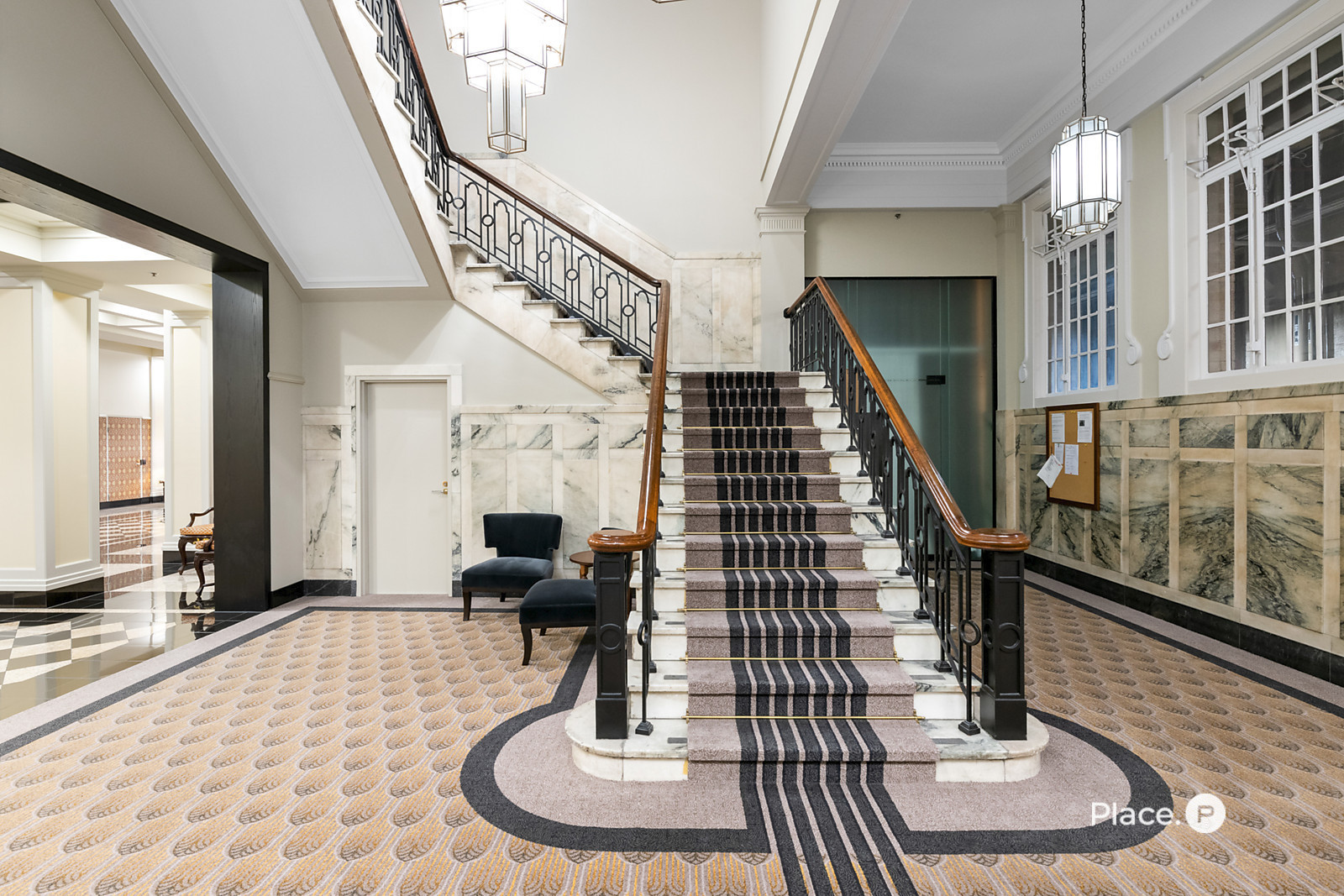 Showcasing exquisite Art Deco architectural elements such as lofty coffered ceilings, decorative cornices, plantation shutters, parquetry timber flooring, marble features and striking pendant lights, the two properties celebrate classic elegance. The building's grand entry foyer echoes the same glamorous style, featuring a magnificent central staircase, marble accents and Art Deco-patterned carpeted floors.