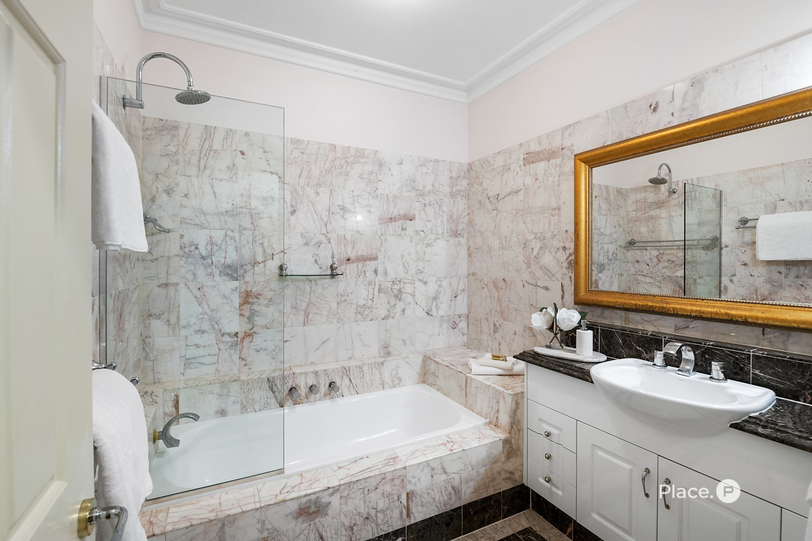 There is also an ensuited master bedroom benefitting from a walk-in robe, plus two additional bedrooms with built-in robes. A well-appointed main bathroom has marble tiling, a shower over a bath and a separate toilet.